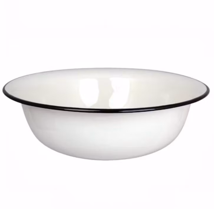 Stort handfat i klassisk gammeldags stil i emalj, off white. Perfekt som diskbalja i uteköket eller sommarstugan. Kan även användas till fotbad. D 40cm h 13cm.