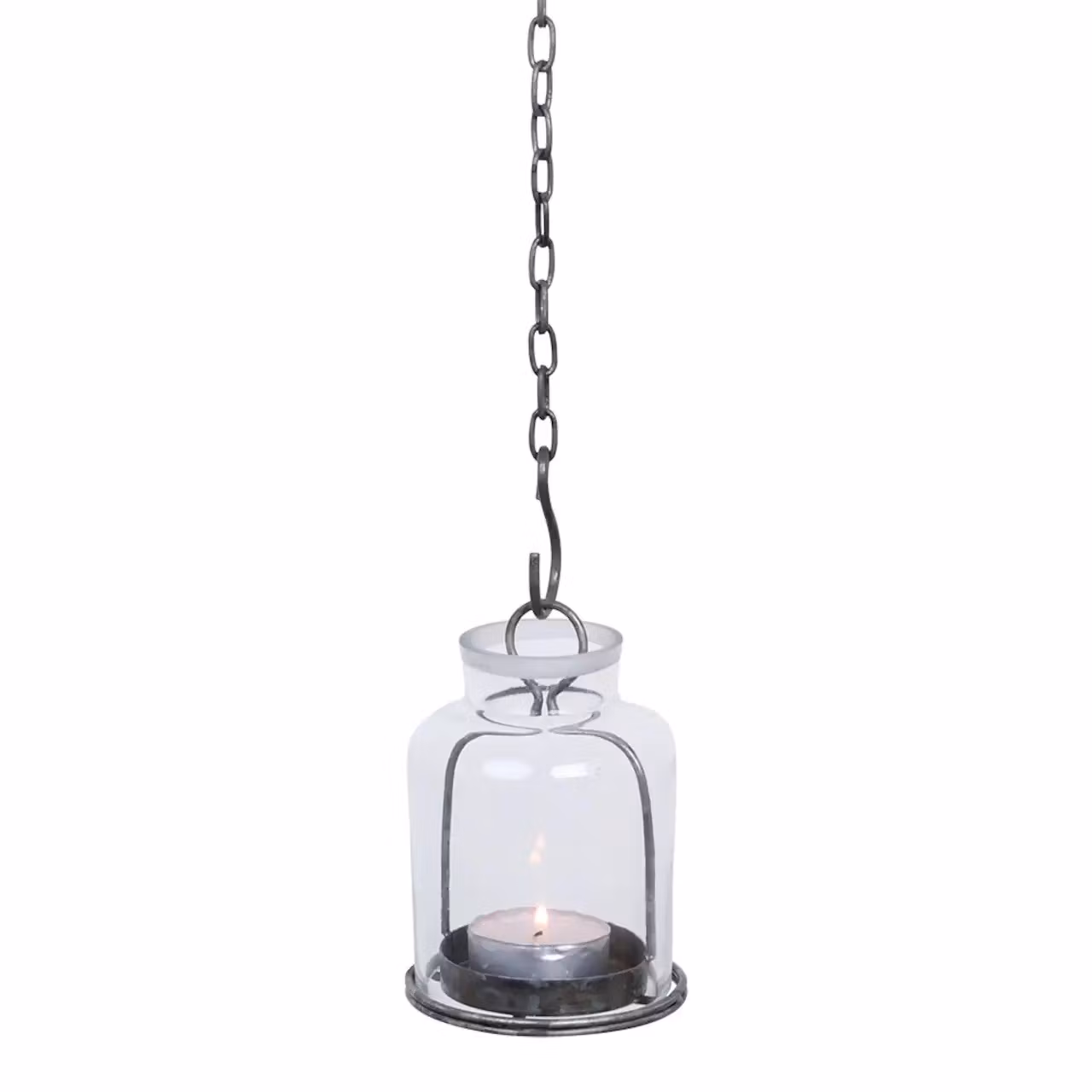 Ljuslykta i glas med zinkfärgad stomme. Kedja med krok i antik zink ingår, L 1 m. Glaset går enkelt att ta av för rengöring. D 8,5 cm, h 12,5 cm.
