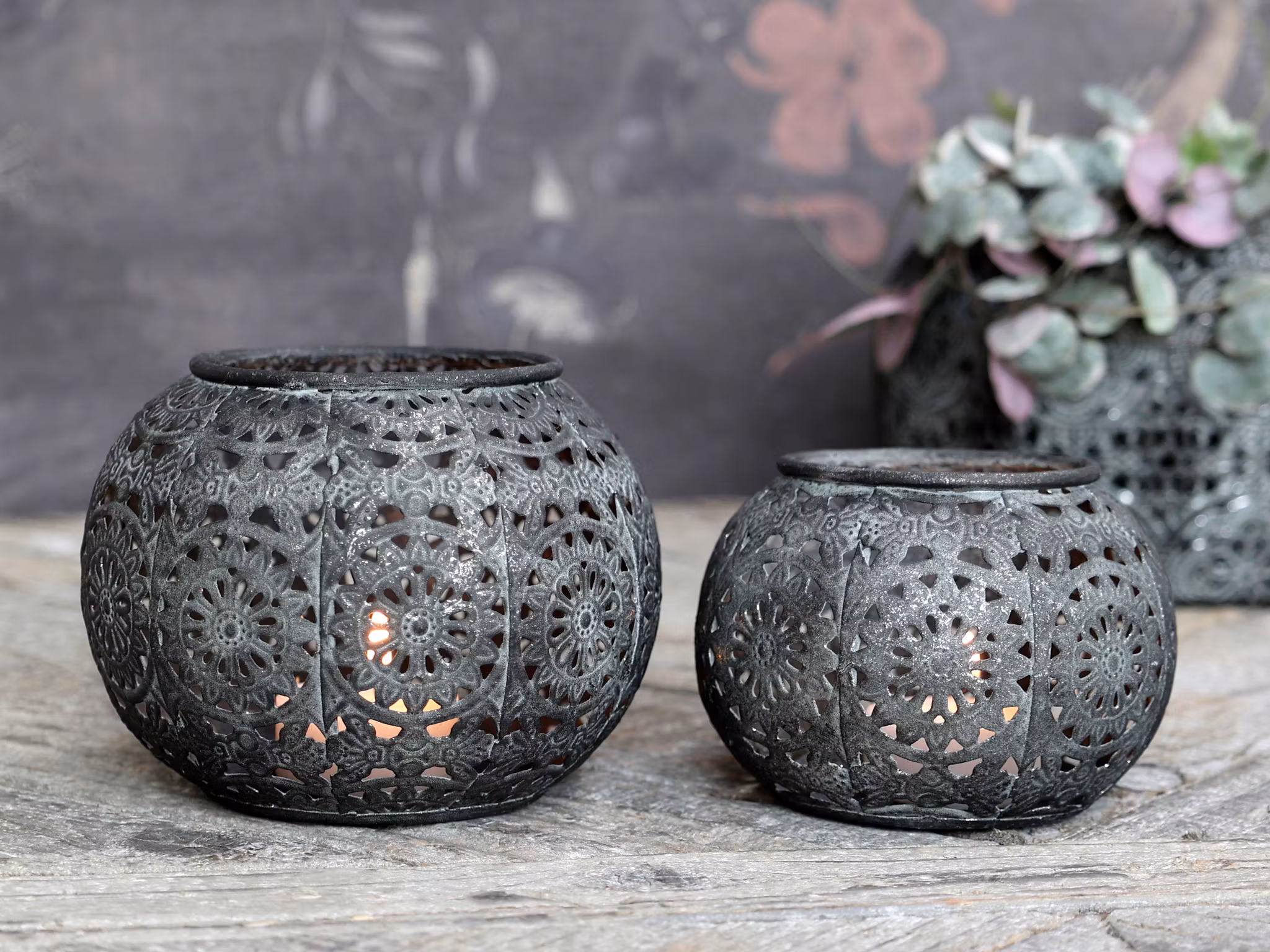 Ljuslykta med mönster i antik zink S 139 kr I lager. Lägg i korgen Dela Lagersaldo: 10 Produktinformation Denna vackra ljuslykta är en mindre modell av två som ger ett otroligt fint mönster som tänd, d 10 cm h 7 cm.
