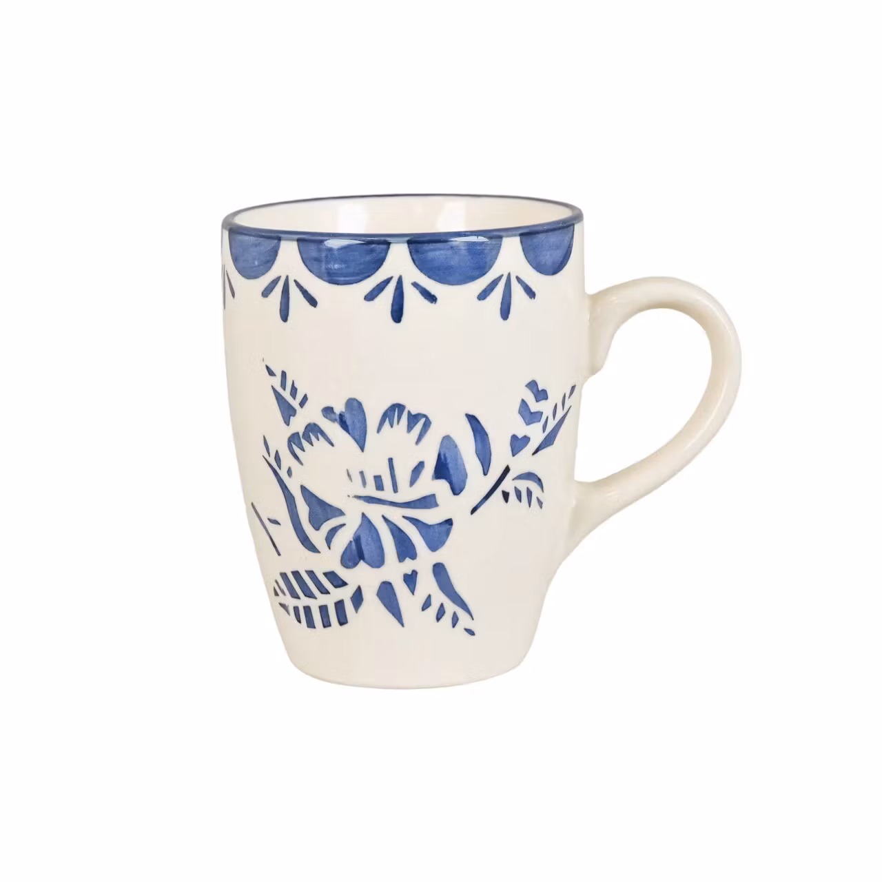 Mugg med handtag i stengods med handmålat gammaldags motiv av en blomma och dekorativ bård. Mönstret i serien Marion associerar tankarna till den franska landsbygden. Fina att kombinera och blanda med de andra motiven. Variationer kan förekomma i porslinet.