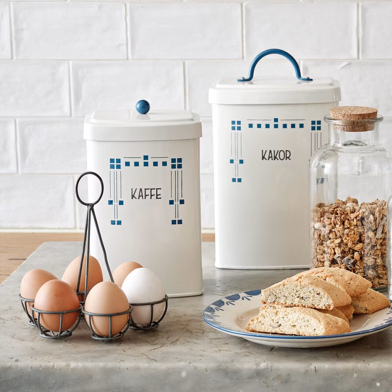 Oval plåtburk med lock och gammaldags motiv av en dekorativ bård och texten kakor. Plåtburken är handgjord vilket innebär att olikheter och ojämnheter kan förekomma.