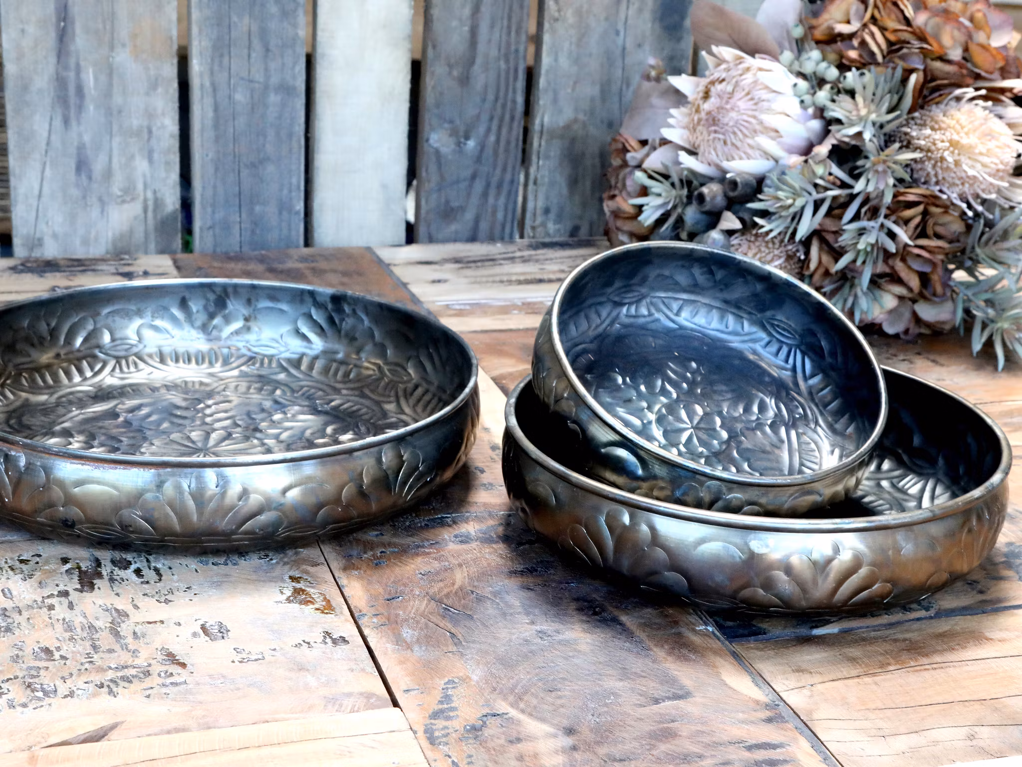 Vacker bricka antik mässing L 369 kr I lager. Lägg i korgen Dela Lagersaldo: 1 Produktinformation Vackra brickor/fat i antik mässingslook, finns i 3 olika storlekar, 6 cm höga. D 31,5 cm