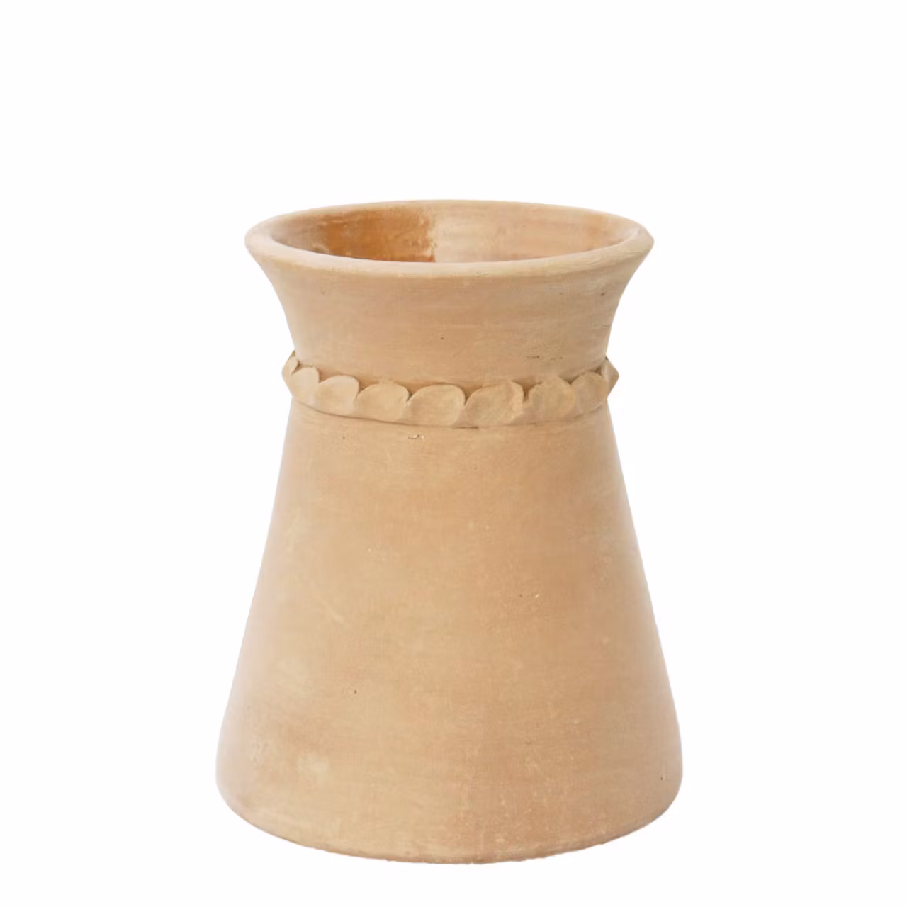 Handdrejad vas i lergods med dekorativ dekor. Lera är ett traditionellt och beprövat material som åldras vackert med sin porösa struktur och har naturliga färgskiftningar. Glaserad insida som tål väta. Låt den rustika oregelbundna leran i vasen få höja din buketts skönhet. Produkten är giftfri. Ø 19 x H 21,5 cm