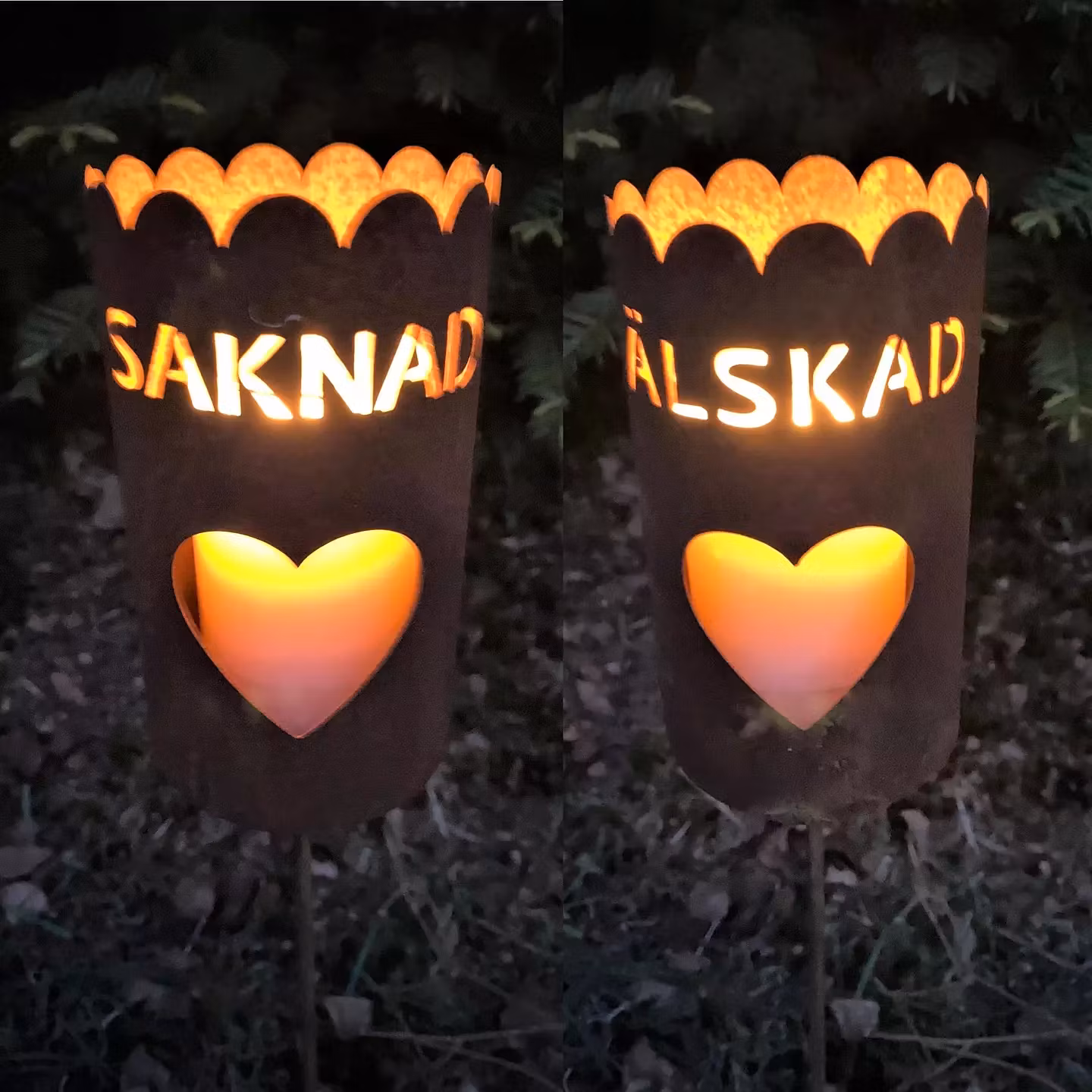 Gravlykta med dubbelsidig text. Älskad och Saknad och ett stort hjärta. Lämplig för gravljus med lock. Storlek lyktan ca 14 cm hög och totalhöjd ca 42 cm. 15% av överskottet går till vår insamling hos Hjärnfonden