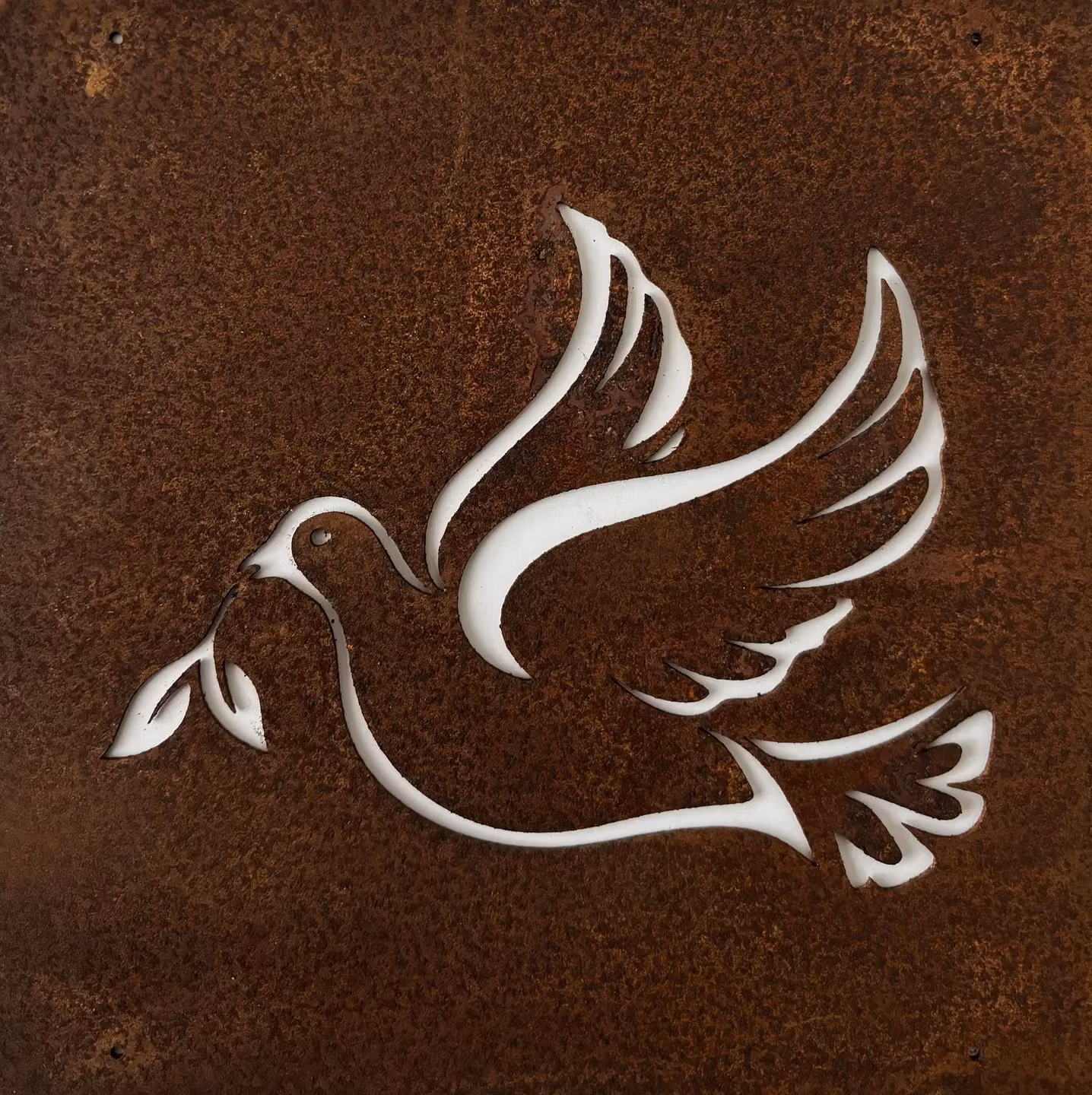 Charmig rostig skylt med genombrutet motiv av Fredsduva. Passar till armeringsnät eller som ensamskylt, ståltråd medföljer. 14 cm x 14 cm. Finns även som Ängel, träd, groda, murgröna, älva och fågel mm.